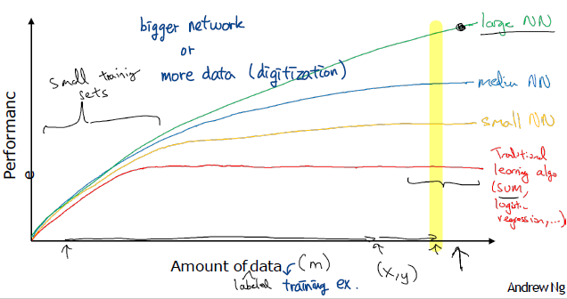 deep learning은 neural network가 클수록, 그리고 데이터의 양(training examples)이 많을수록 성능이 향상된다.